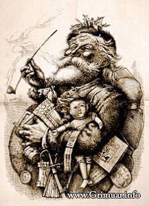 Демонология » Славянская демонология Темы: новый год Всем известный и привычный для русского человека Дед мороз, но когда и как он возник в нашей культуре и почему эта публикация в рубрике Демонология? В различных культурах образ этого дарителя представляется различным и называется он по разному, было бы неверным не упомянуть хотя-бы тезисно об этих различиях: Франция - Пер ноэль Китай - Шень Дань Лаожень Италия - Баббо Натале Япония - Одзи Сан Германия - Вайхнахтсман Финляндия - Йоулупуки Швейцария - Николаус Содержание публикации История деда морозаДед Мороз в РоссииЗлой дух Морозко (Мороз) Жертвоприношения Деду Морзу Одежда, транспорт и посох Деда Морза Спутники Деда мороза Эльфы и гномы Снегурочка Крампус История деда мороза Самым известным возможным прототипом Русского деда Мороза является Санта Клаус, поэтому не затронуть и его историю нельзя. Святой Николай - наиболее известный прототип указанного Деда Мороза это св. Николай, христианский святой прославившийся тем что любил делать подарки нуждающимся, как гласит легенда разнося их иногда в мешке и незаметно подкладывая их у дома нуждающихся. Прототип деда мороза Санта Клаус (да да, ну всё-таки да, не бросайте в меня камни) обязан своим окончательным формированием трем людям: Клемент Кларк Мур 1821г - стихотворение (Рождественская ночь) Клемента Кларка Мура в котором рождественский даритель Санта предстает добрым старичком который спускаясь по дымоходу с мешком подарков, чтобы подарить их, в этом же произведении Дед мороз Санта клаус предстает уже с белой бородой, в шубе и с красным носом, ездит он уже на упряжке из восьми оленей к шеям которых привязаны колокольчики. Томас Наст 1863 г - знаменитый американский художник Томас Наст, рисует для журнала Harper’s Weekly, серию политических карикатур в которых используется персонаж Санта-Клауса, нарисованный по мотивам произведения Кларка, именно в них как признается многими образ Санта-Клауса был сформирован почти полностью за одной не большой деталью а именно цветом. Хэддон Хаббард Сандблом 1931г Сандблом создает илюстраци для рекламной компании CocaCola в ней образ Санта-Клауса получает красную шуьу и окончательно приобретает современный вид. Дед Мороз в России Россия же несомненно привнесла свой вклад в этот образ, его внедрение началось при Петре Первом, тогда прототипом был взят святой Николай чудотворец, но все-таки считать Деда мороза клоном Санта-Клауса при общей схожести нельзя, а его происхождение так и вовсе тянется к славянским богам и духам. Современный Русский Дед Мороз даже имеет собственный почтовый адрес, как ни странно, не на полюсе и даже не в канонической финляндии, а в Великом Устюге, кому интересно вот Адрес Российского Деда Мороза: 162340, Россия, Вологодская область, город Великий Устюг, дом Деда Мороза Злой дух Морозко (Мороз) Русская сказка описывает Морзко как доброго духа, но сказка на то и сказка чтобы быть творческим вымыслом, на самом деле это совсем не такой простой и добродушный дух. Зимний злой (внезапно) дух Морозко почитался славянами до христианской эпохи Руси. В русских легендах прототип Деда мороза описывается как символ морозов, кузнец, сковывающий льдом воду, осыпающий зимнюю природу снежным серебром, а в тяжелое время и защищающий русских от наступающих врагов, в тоже время это жесткий и возможно в