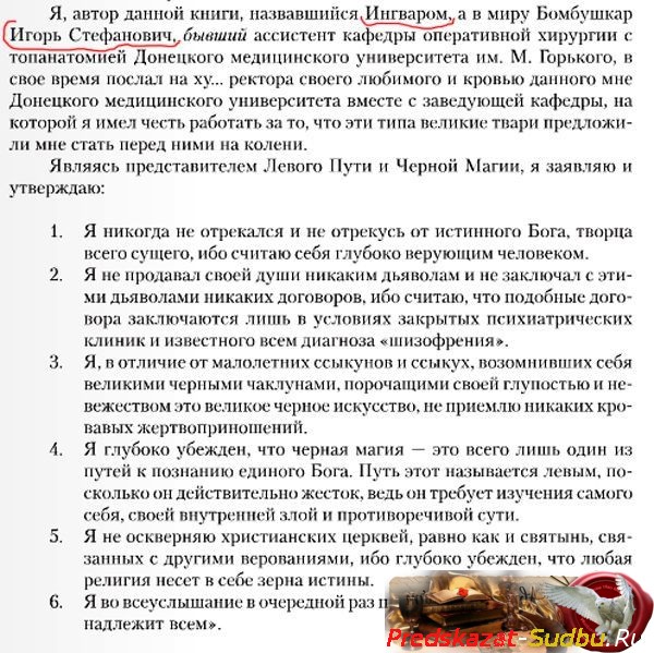 Мнение Обучение магии » Начало пути и его риски Не так давно и я был одним из начинающих свой долгий Черный путь. И сегодня я хочу вам рассказать о такой Странной теме как ловушки в книгах Черной магии ! Как начинающий ранее я постоянно попадал в сети этих ловушек (так как не знал о ихнем существовании) и всегда в голове был некий бардак Я все не мог свести концы с концами - чем большее я читал тем меньше я понимал что либо ! Подчеркну что тот период для меня закончился совсем не давно - в тот момент когда я понял что есть ловушки (и я вам это докажу !) ! Немного о себе - вы должны представлять о том кто пишет эту статью (или автора книги) - и это должно у вас стать как закон, Если вы изучаете черную магию ! Сам же я как и обычный человек начинал с Интернета ! Насобирал кучу книг с интернета (Особенно Ключики Соломона ) и мае обучение начиналось именно с тех старых книг ! Сейчас же я редко изучаю книги - мне довелось встретить хорошего учителя, Который пролил свет в мое сознание и сейчас я работаю исключительно в Сибирской традиции погостной Магии ! Ясли бы я ранее наткнулся на статью которую я сейчас пишу то это бы многое дало мне понять и я бы сохранил кучу времени и вложенных сил ! И читатель сейчас в этом убедиться на личных примера ! Начинаем Сначала переходим по ссылке и читаем правила Черного мага ! (это предыдущая статья Автора viscum) - если уже прочли то очень хорошо ! вот ссылка : Правила черного мага Очень хорошо что он уже описал эти правила - легче будет объяснить свой материал отталкиваясь его правил ! Но добавлю - что автор Viscum действительно описал правила к которым придерживаются черные маги (С небольшим дополнением от себя - с чем я немного не согласен (но по сути это особо ничего не решает )) ! Я много раз слышал о подставных ловушках в книгах черной магии, но Обучаться то ведь как то нужно ! И я пришел к небольшой закономерности - Есть книги которые выпускают что бы сбить человека (Ловушками) но среди этих подставных книг есть и настоящие книги. Только их нужно научиться находить ! Каждый раз беря новую книгу в руки для изучения первое что мы должны проверить это Автора книги (Как создавалась книга, кто принимал участи при написании, история к книге ) Автора часто любят похвастать своим якобы черным выбором и за частую допускают ошибки в описании ! Ниже я демонстрирую пример из известной книги с которой начинают многие начинающие, это Руководство по Некромантии (Учебное Пособие ) - автор Игорь Стефанович ! В этой книги сделано хитро и Автор не описывает не пред историю книги не о самом себе ! Идет описание о чем книга ! В книгах которые не дают в себе сомневаться нужно переходить быстро в Ритуалы и искать ихнее соединение с библией либо церковью ! Сейчас объясню принцип ихних действий - Когда делают черные ритуалы (всегда приходит сила Черная) и если в этот момент человек завет силу светлую (то есть ангелов либо произносит святые текста из библии ) происходит следующая вещь - Начинается вражда как замыкание (а спровоцировал ее маг - он же призвал сначала черных а затем белых) И тот кто делает подобный обряд будет наказан в двойне - сначала силами белыми затем силами черными ! (Думаю здесь политика понятна) По этому подсадные ловушки направлены так что бы человек попробовал , обжегся - и больше таким не занимался ! В таких книгах много пишут правильно что б