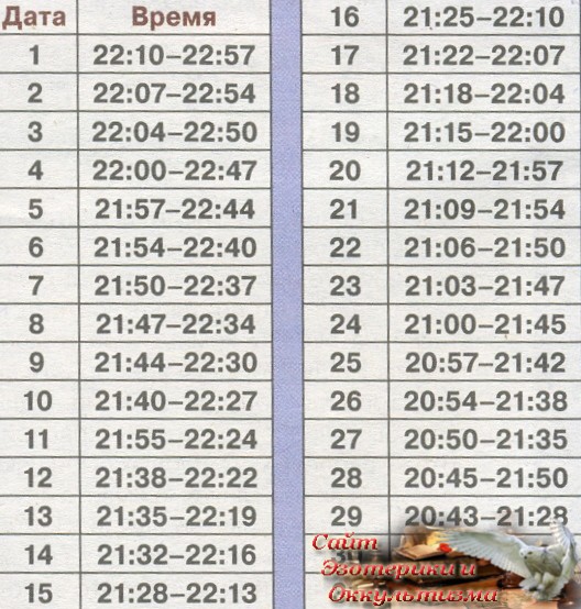 Тем, кто проживает в местности, находящейся вблизи границы часовых поясов, советуем ориентироваться на самую середину момента. Например, если в таблице указан период с 18:25 до 19:15, на стыке часовых поясов его нужно сократить до 18:40-19:00.